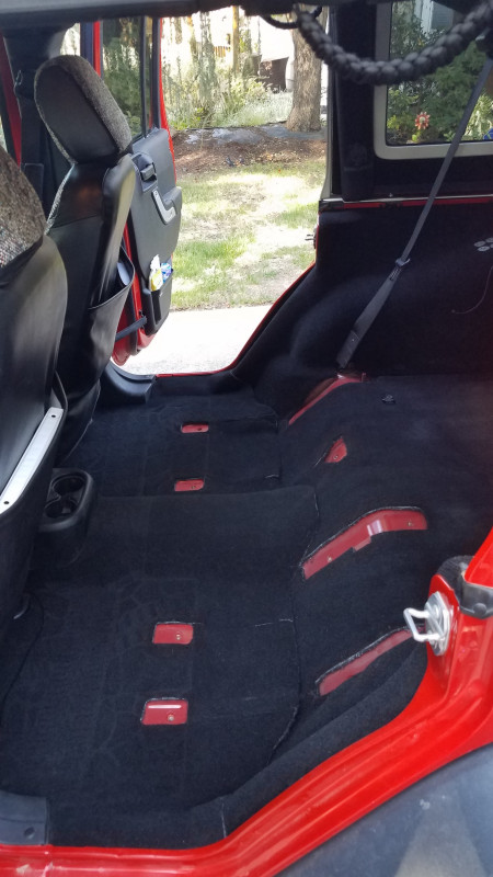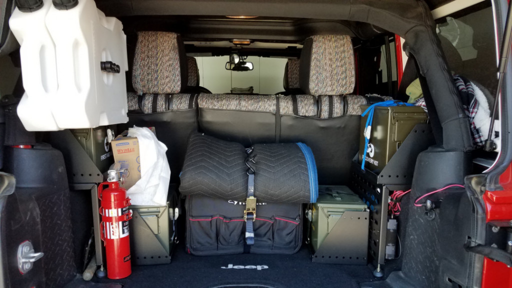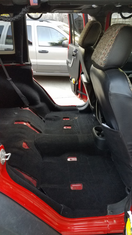 Before you start, you have to get everything out of the back of the Jeep. And take it from me, if your rig has as many trail miles on it as mine does, you'll work at getting some of those seat bolts out. Also be aware that you can separate the 40% seat from the 60% seat before you remove them. Makes handling them easier. Including all the gear I had in the Jeep, it took me several hours to get to the point where it looked like what you see below.