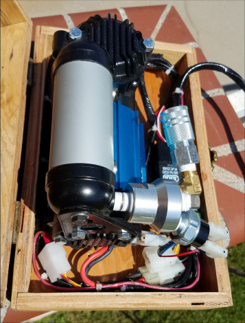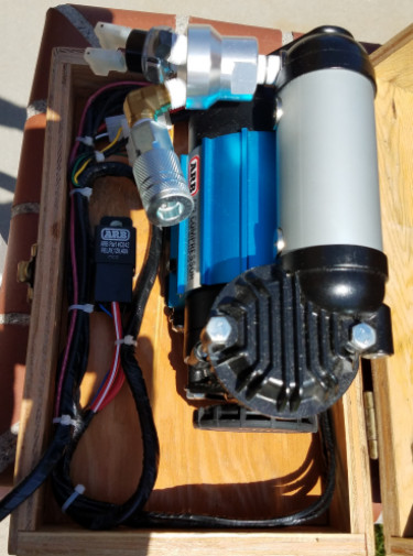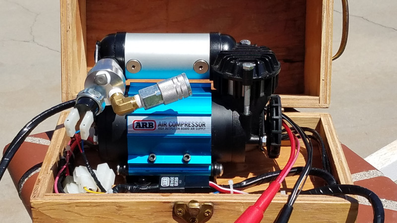 I have a small, portable ARB CKMA12 High Output Air Compressor that I bought from Extreme Terrain. It is designed to bolt onto the vehicle somewhere ... under the hood, between the frame rails, etc. I made some modifications to the wiring and did a little modification work to an old wooden box I had, and now have a fully portable air compressor that works perfectly with that air hose in the cargo bay to refill tires before I get back on-highway. It is nicely protected, so I have no qualms about throwing it in the back of the LRB and hitting the trail with it.