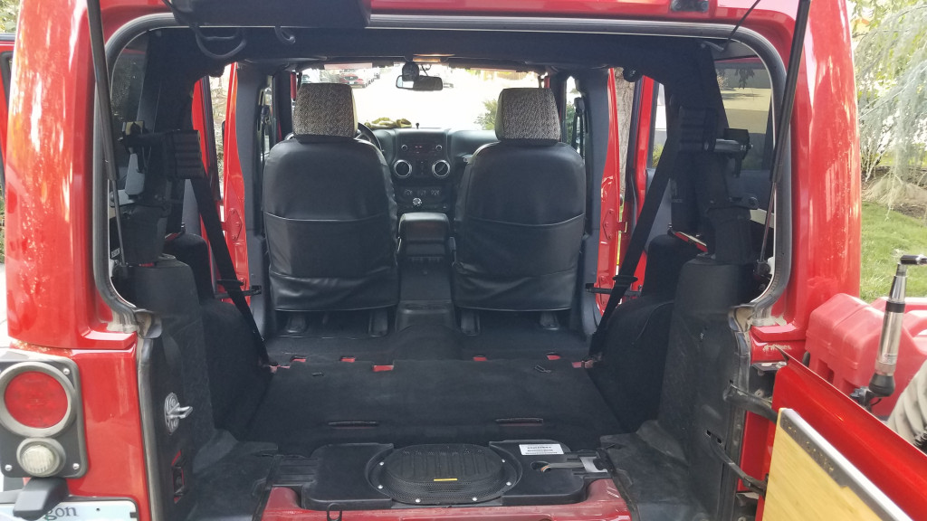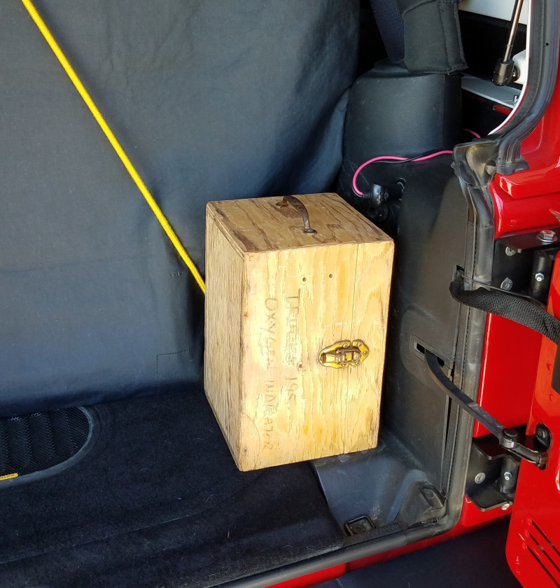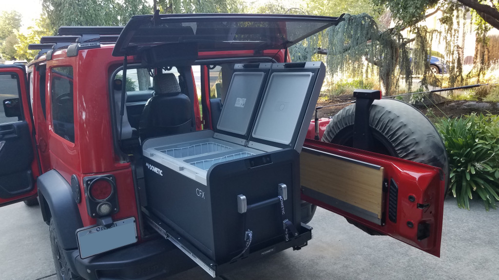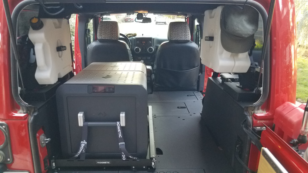 It might have fit behind the rear seat cross-ways, but we wanted to put it on a slide-out tray (the Dometic CFX3 SLD75, to be exact) that would allow us to slide the 'fridge out from the tailgate area ... and there is no way you can do that in a JKU with a cooler this big, unless you remove the rear seats. Are you seeing where this is going?