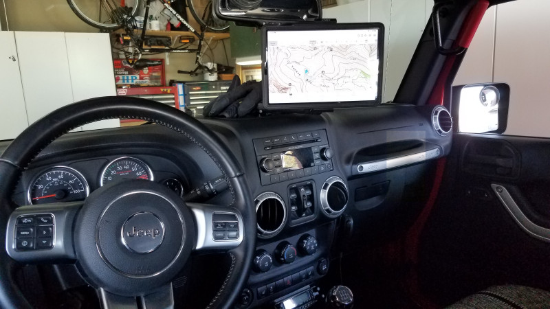 So my kids came to my rescue again, after listening to me grumble about what I had been using for mapping software on an iPad. Let me start by saying the Samsung Tab S5e was already in my possession. What makes that tablet cool is the hardware from 67 Designs and Joby that allows me to have it instantly available to me anywhere I go in the LRB. 67 Designs has a selection of JK-specific parts that allow one to mount any phone or tablet to a base in the "pocket" in the top center of the panel. I was given the single-ball JK Mount with the Universal Mount for a smart phone with the matte finish arm. While the universal mount for phones fit my Samsung Galaxy S7 just fine, I wanted to use the tablet, which was a wee bit too wide for the universal mount. Enter Joby with their Grip Tight Mount PRO Tablet. Mating this to the end of the 67 Designs arm also required a Camera Mount adapter from 67 Designs. It all bolted together in just a few minutes after I let the base mount adhesive cure in the panel pocket overnight. What you see above is the result. When I want to use it, my Tab S5e is right there where I can easily see it, but it does not restrict my view of the trail at all.
