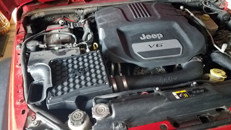 So after making several runs up and down California with a cargo trailer in tow, I started wondering about ways to make my engine work a little less while hauling the loads. I did a little research and found there are a lot of vendors in the aftermarket with whiz-bang induction systems for JKs. But I went with K&N. Why? I've used K&N equipment on another rig that hauled trailers around the country (all hail The Beast), and went with a known and trusted manufacturer. I don't think I was let down.