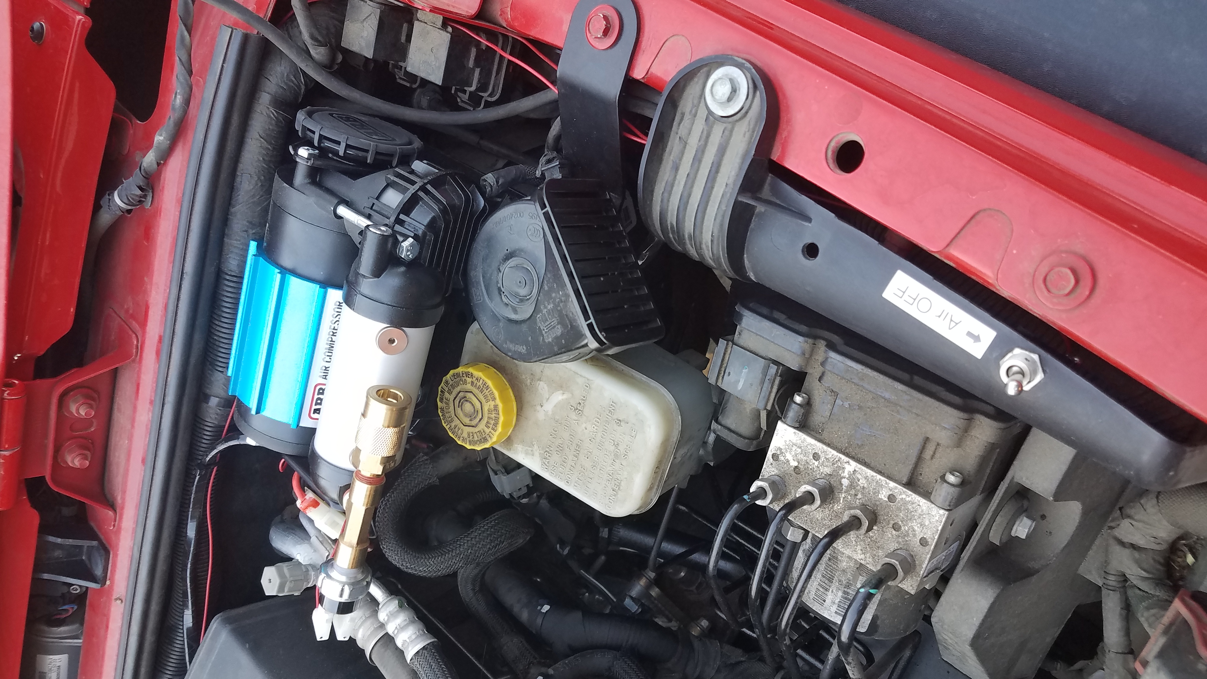 This is the on-board air compressor system I installed. It is the same ARB single-barrel air compressor I used to make the portable unit described above, the CKMA12, purchased from the same vendor. It is mounted on a bracket made by EVO Manufacturing, their model EVO-1097, expressly designed to mount this compressor on a 2012 - 2018 Jeep Wrangler JK. I seriously modified the factory cable harness for this compressor to eliminate all the extra connections for use with ARB air lockers, and wound up with the very simple arrangement shown in the below diagram. I was originally going to put the power switch for the system on the instrument panel somewhere, but the opted for the much easier location shown. The only time I need to power the air system is when I'm actually going to connect a hose to it, so I figured this would be an optimal location ... out of the way but very close to the equipment. The only additional parts I had to buy were the brass tee and hose coupler. I had the toggle switch in a parts box, it is a simple SPDT on-off switch.