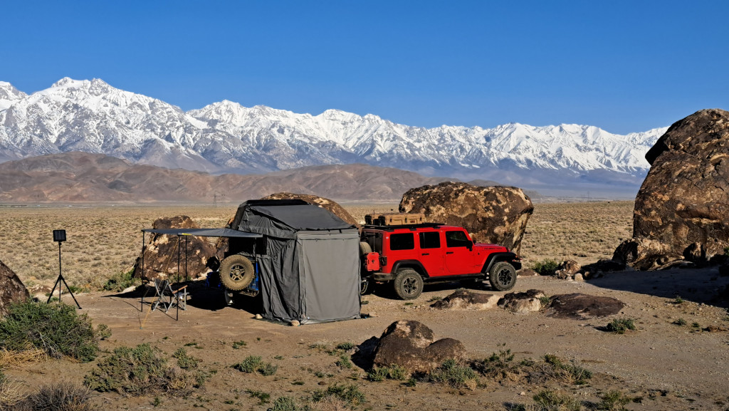 Yep, we tried this again, but this time I took the LRB to a shop that had a "jeep guy" on the payroll. Ten minutes chatting with this guy convinced me that he had been knocking rocks and chasing trails most of his adult life, and after watching him do the work I was even more convinced. Bottom line: since the LRB runs with the AEV Dual Sport 2.5" Lift Kit, the AirLift kit for the stock Jeep JK suspension was unsuitable. What we wound up installing was AirLift's kit for a half-ton Dodge Pickup, which also has coil springs, AirLift part number 60828HD. These things worked like a champ on our shakedown to the Inyos. I run about 10 pounds in them when we are not towing, about 30 when we are. Their presence makes the unladen ride feel a wee bit stiffer on highway, but so far I have not noticed any difference in handling on the highway or on the trail. Shoutout to Bob at Advantage Tire, Inc. in north Medford. Great installation, and he didn't mind having a couple of fellow Jeep nuts hanging around while he worked.