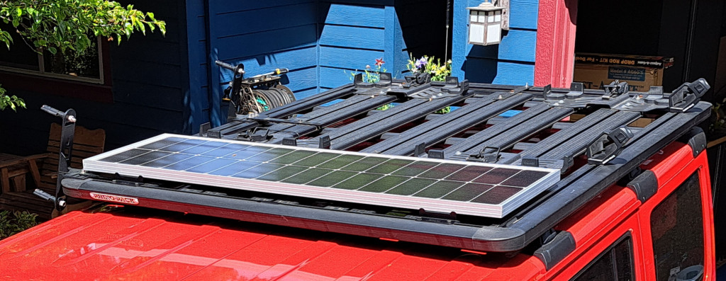 The RedArc can be charged by shore power (115VAC ... "wall current"), 12VDC from the vehicle charging system, or from solar panels. So this project was about adding a solar panel in a rather small space, only 19" x 56", on the forward end of the roof rack on the LRB. I went searching on line for a panel, of any power rating, that would fit an area that small. I figured I'd be limited to about 50W of power generation with that footprint, and spent some considerable keyboard time until ...