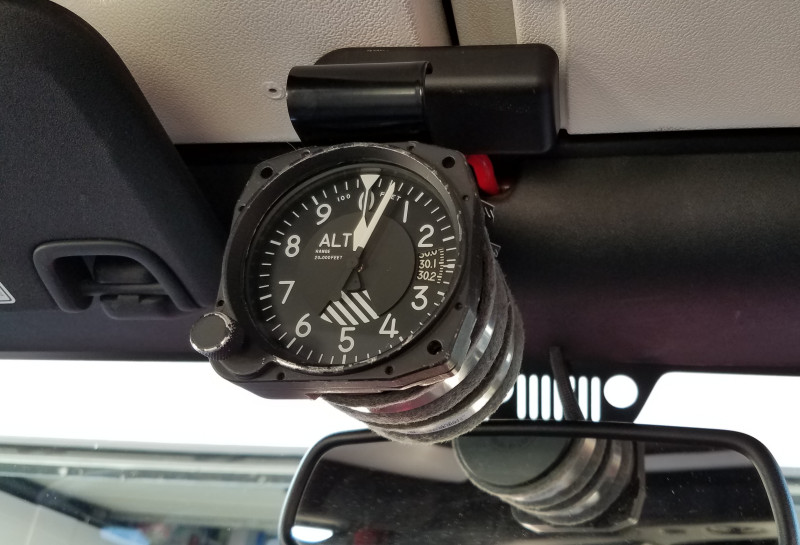 Above is my altimeter, mounted just below the footman above the rear view mirror. I used a Rugged Ridge 11503.95 CB Radio Mount Bracket, a couple of shiny new hose clamps, and some heavy duty felt pads to securely (and quietly) mount the altimeter where I can clearly see it. I got the mounting bracket from Extreme Terrain.