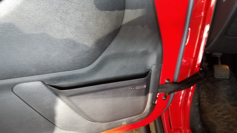 The JK series came with some storage pockets in the doors. They were made of some sort of fabric netting which stretched horribly over time, to the point where things stored in them would wind up getting slammed in the door frame because they hung so low. I replaced these stock storage pockets with JK Pockets from Slickrock Gear. These are made of a hard plastic material that roughly matches the inside door panels.