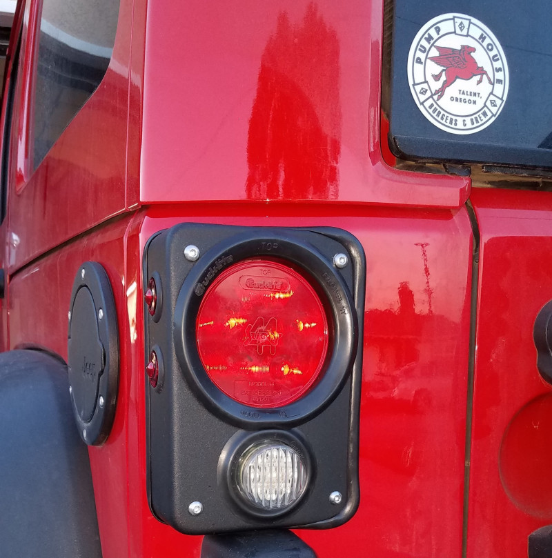This tail light issue was apparently bothering me enough that I was grumbling to my son about it. He and his wife decided that I had grumbled enough, so they bought me a Christmas present: a Warrior Products 2960 Steel LED Tail Light Kit. This solved my clearance problems! The LED assemblies mount in rubber mounts that fit into the solid steel carriers. This assembly stands off from the sheet metal of the backside of the vehicle about an eighth of an inch less than the stock tail lights. It was enough! Now my RotoPax cans and their mounting hardware clear the tail lights with the tailgate door fully open. Sweet!