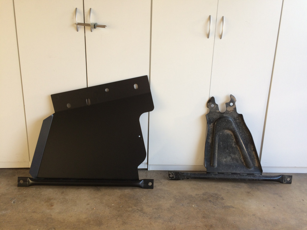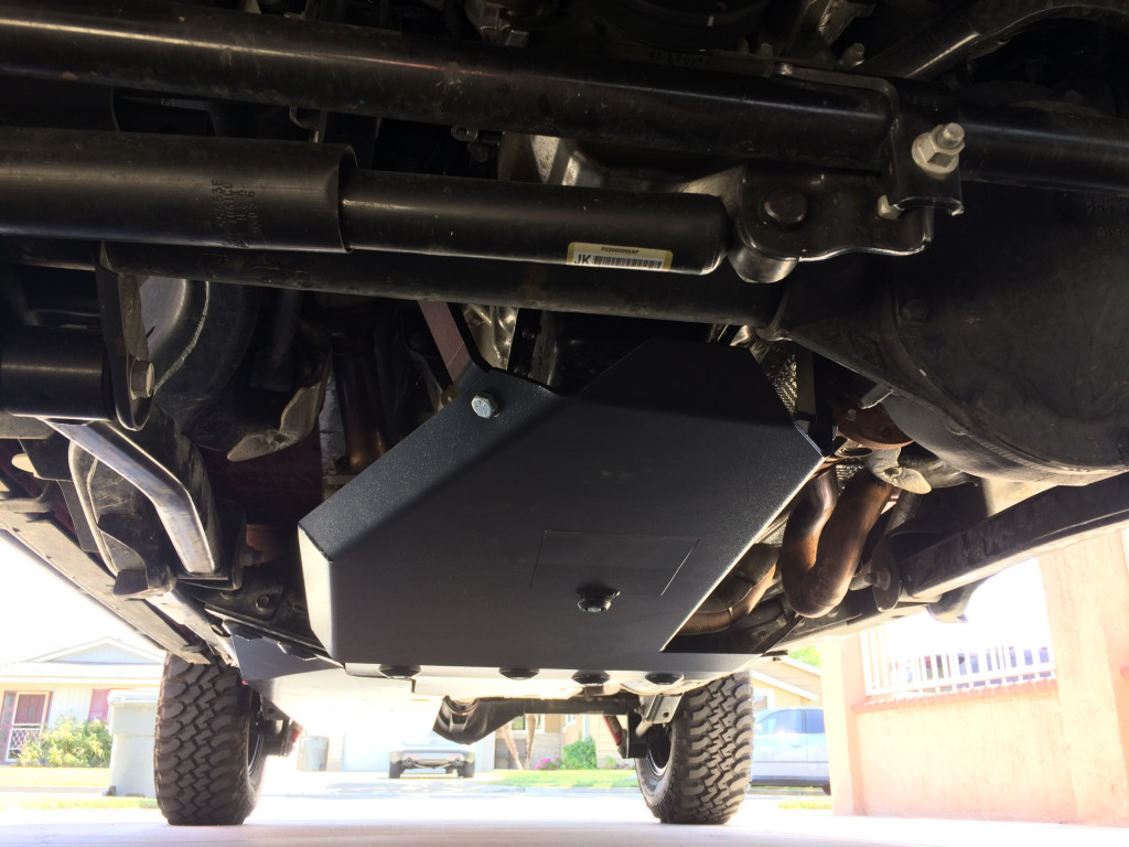 The very first thing I wanted to do was get some real armor between me and the rocks. To this end a full set of Rock Hard 4X4 skid plates seemed to be just the right thing for me and the LRB. As mine is an Unlimited (4 door model), I needed a bit more than than the 2-door rigs do, most of the extra covering the fuel tank. Above is a visual comparison between the factory skid plat that protects the transfer case (right), and the Rock Hard 4X4 product (RH-6004). The stock unit is cast aluminum. The aftermarket unit is 3/16-inch, laser-cut plate steel, CNC bent and jig-welded.