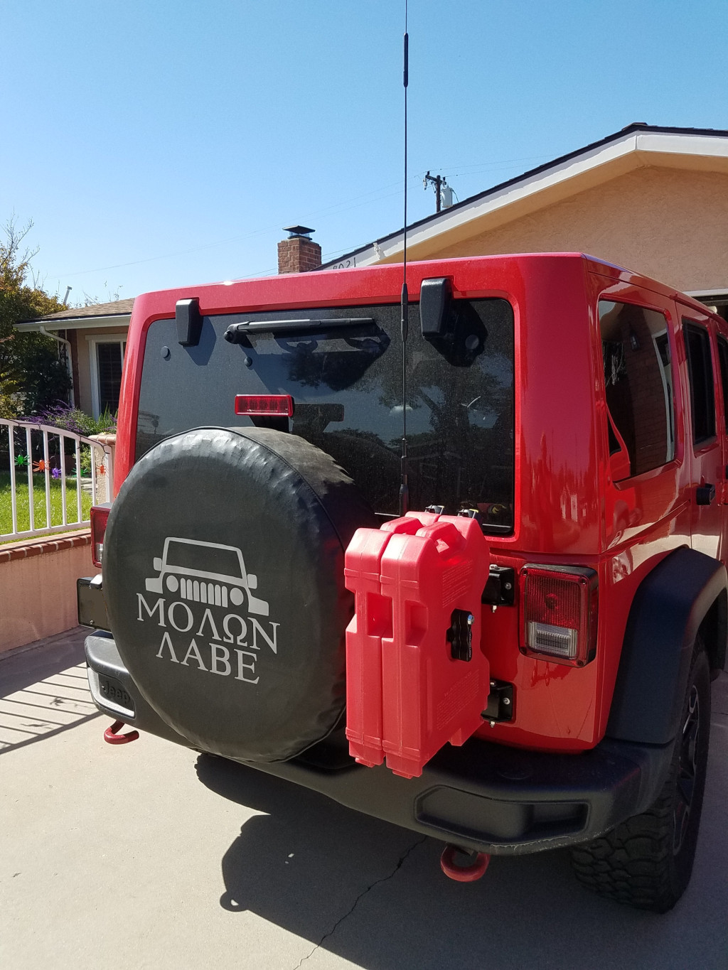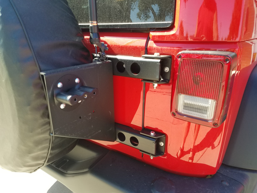 The angular plate hanging beside the spare tire is also a MorRyde product, their JP54-012 Hinge Mount RotoPax Carrier. My JK has a 22.5 gallon gas tank, but having a little extra fuel along can't hurt, right? This carrier allows me to carry two 2-gallon RotoPax gas cans out back. Helpful if your fun begins to outlast the on board fuel supply. And the carrier has a handy location for an antenna mount for a two-way radio system.
