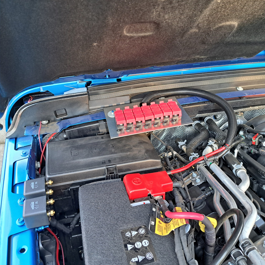 A similar power system will eventually be installed on that Goose Gear deck in Bonnie's cabin. Each of these power systems is configured to take 20 amps of Bonnie's alternator output to charge their batteries, and I needed to build the infrastructure to make that happen. Above you will note a six-way (seven pole) distribution block on an aluminum plate on the firewall. This block has a 400A power-handling capability and uses MIDI/AMI fuses that bolt in place. It is Bussmann / Eaton product in the LMI series, I bought mine at Mouser Electronics. It has an operating temperature range of -40° to +185°F.