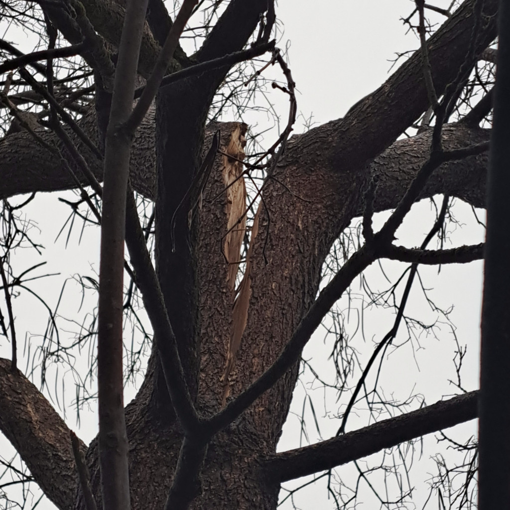 So the winter weather cleared off after a couple of weeks, and when it all melted off we discovered this down in the southeast corner of our yard. I guess we'll be trimming a lot of limbs above this split. My friend, who happens to be an arborist and a volunteer wildland fire fighter (and a fine Scotsman as well), looked at this and pronounced the tree healthy if a bit overweight. He says that a through bolt can bring that split back together, once we thin a lot of the growth protruding from those main limbs. I guess I know what'll be keeping me busy once spring gets here for real. At least I may get some good firewood out of it. Of course, I still have to build the rack / enclosure to store that in as well ...