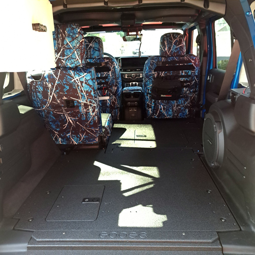 Above we see the completed V1.0 installation of the Goose Gear decking in La Conejita's Jeep Wrangler JL. I say version 1.0 because neither of is is sure the portion of the back seat that is still installed will remain there. More on that in a moment. This is the Stealth Sleep Package that Goose Gear makes for her model of vehicle. I have a very similar system in my 2017 Jeep JKUR, for which I removed the entire back seat. These decks provide a lot of under-surface storage, and also a base platform on which you can mount various camp kitchen and / or storage systems that Goose Gear makes, or upon which you can build your own systems. They are quite strong. (Info about what's in the 2017 JKUR can be found here.)