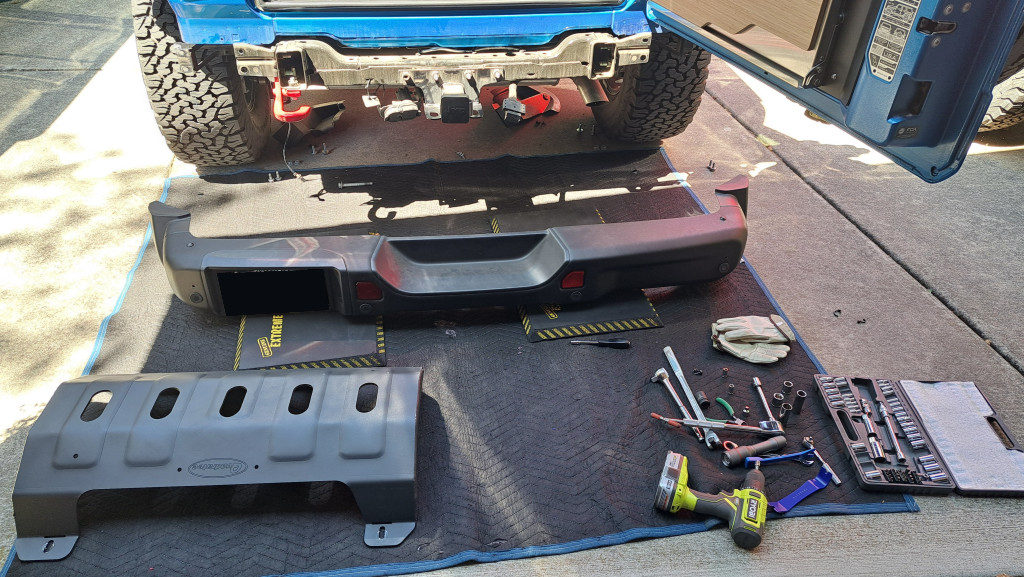 You'll note the red reflectors in the bumper, adjacent to the depression for the spare tire. These are handy, but do nothing when you're trying to hitch or unhitch a trailer in the dark. Hence the project: replace those reflectors with a pair of Oracle Rear Bumper LED Reverse Lights supplied by my favorite off-road aftermarket provider: Quadratec. Those lights throw a flood patter of 1000 lumens of white light, exactly where you need it to illuminate the area between the back of your rig and the front of your trailer. But the installation ... ¡ai chihuahua!