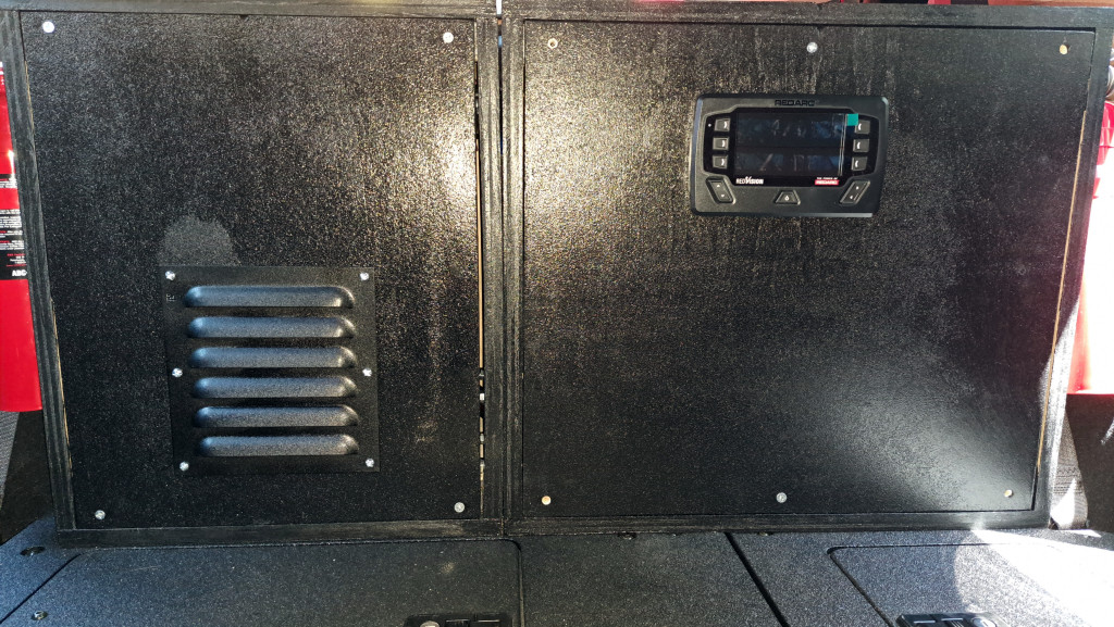 For those of you who have perused the "Rubicon" page here at The Range, this system will be electrically identical to what is in the LRB. That system is all in one cabinet, which does a great job of eliminating most of the view out the back window as seen in the inside rear view mirror. La conejita wasn't fond of that method, she wanted that view unobstructed, so this design basically splits the system in half and mounts the equipment in two smaller cabinets. Clear view out the back, dear!
