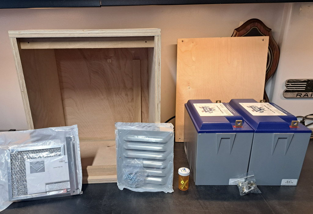 Here we see the major components of the battery portion of the RedArc power system. The cabinet (manufactured by Baker Enterprises in Phoenix, thanks Bob!) is 3/4" birch ply, and it is designed to hold only the two batteries and power cables, plus some small components that are part of how the battery management system monitors the battery performance. The plastic-wrapped items in front of the cabinet are a filtered air intake for the system. When completed, the two cabinets will each have an exhaust fan for cooling, and this is where the cooler outside air will be drawn from, providing good airflow to keep the batteries cool, especially when they are charging.