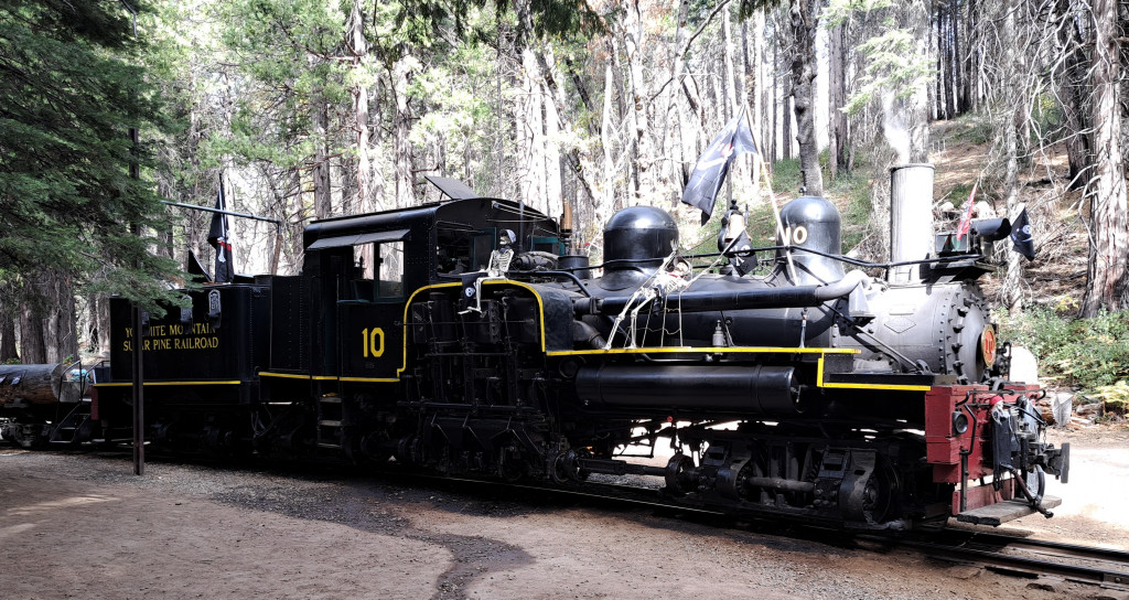Yosemite Mountain Sugarpine Railroad engine # 10, taken at the end-of-track loop 26 October 2024. She is seen here "decked out" for Hallowe'en.